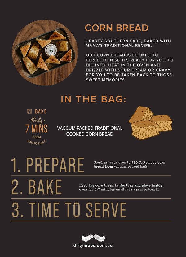Remove plastic and cover from cornbread, enjoy cold or heat in over for 10mins to warm through. We recommend you enjoy with a side of sour cream, or your favourite condiment.